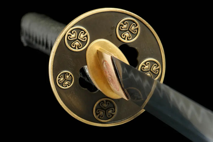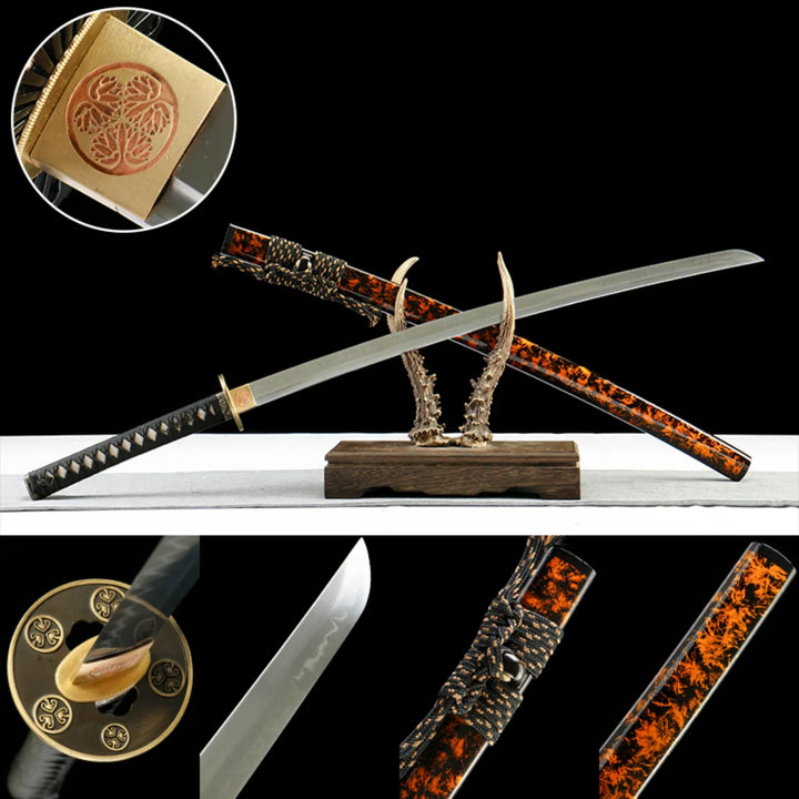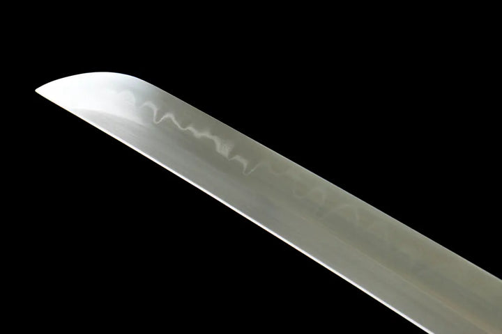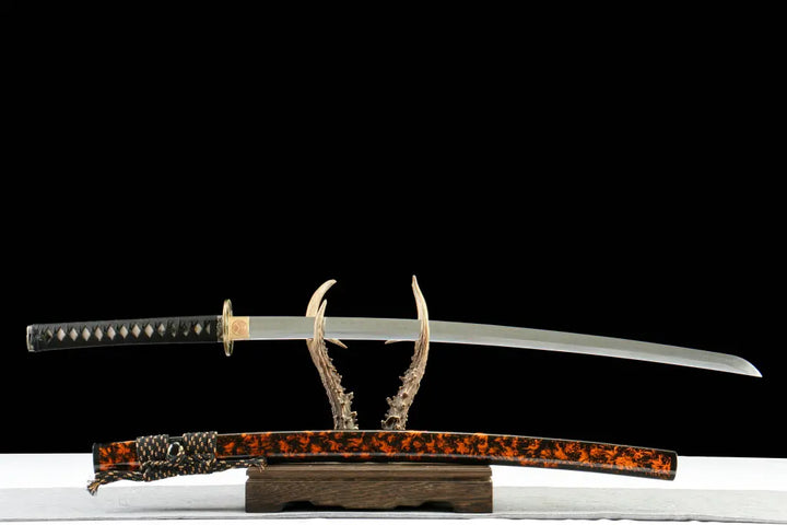 - Hand-forged T10 steel blade with authentic clay tempering, creating a vivid hamon line