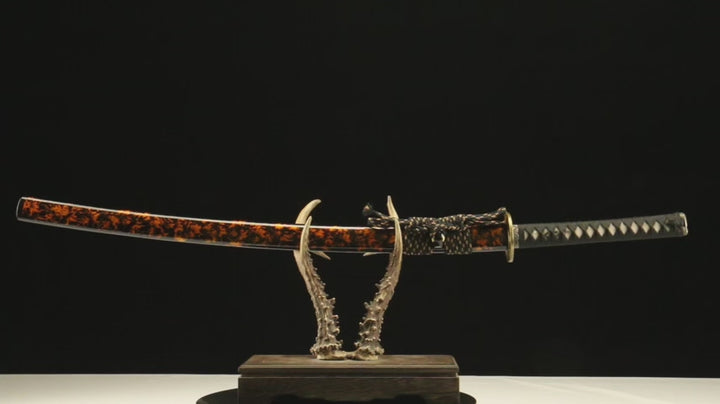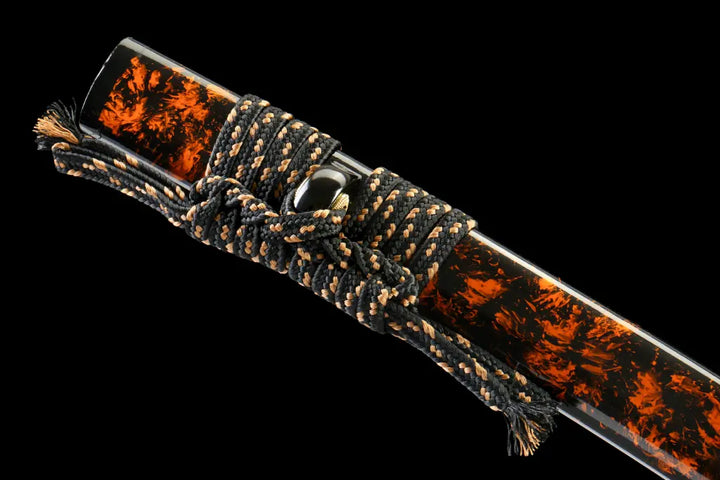- Striking saya in lacquered flame pattern, offering a unique and bold appearance