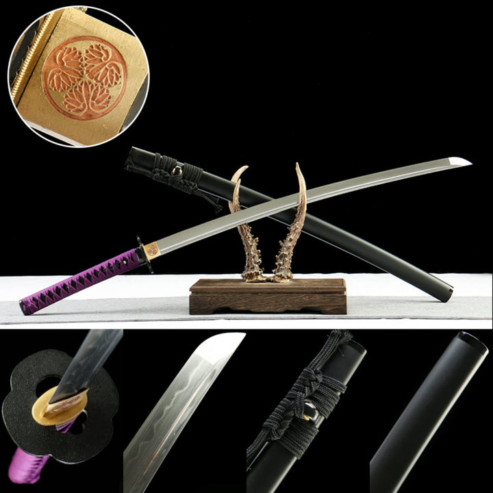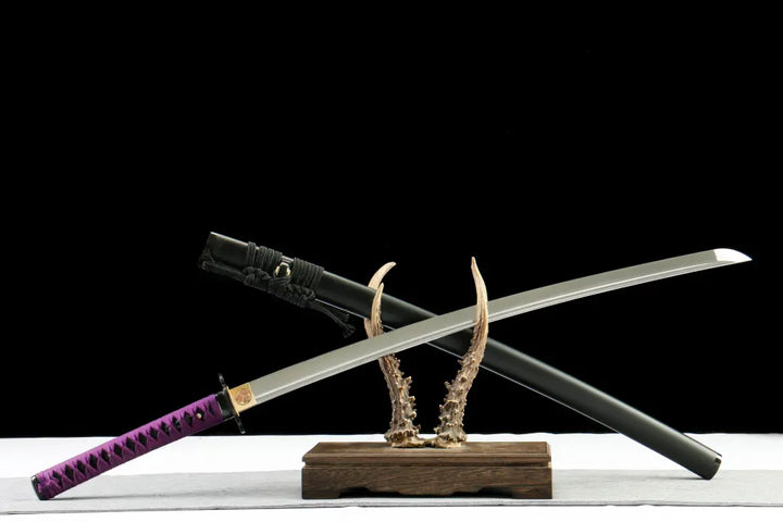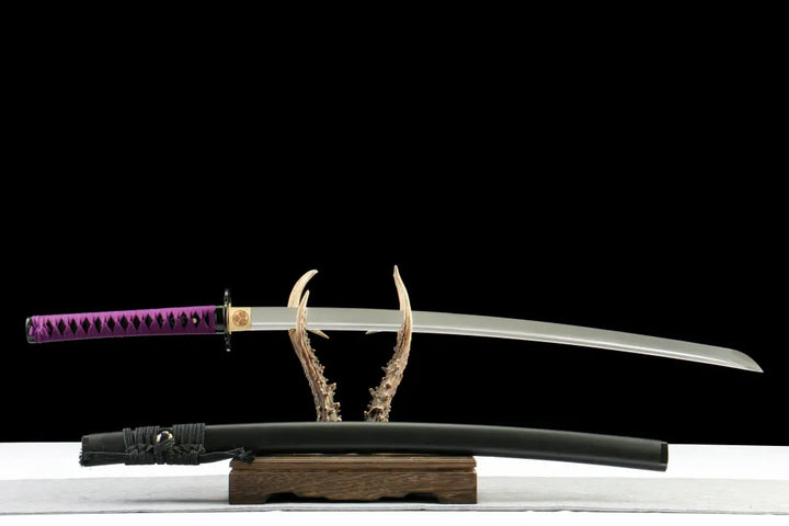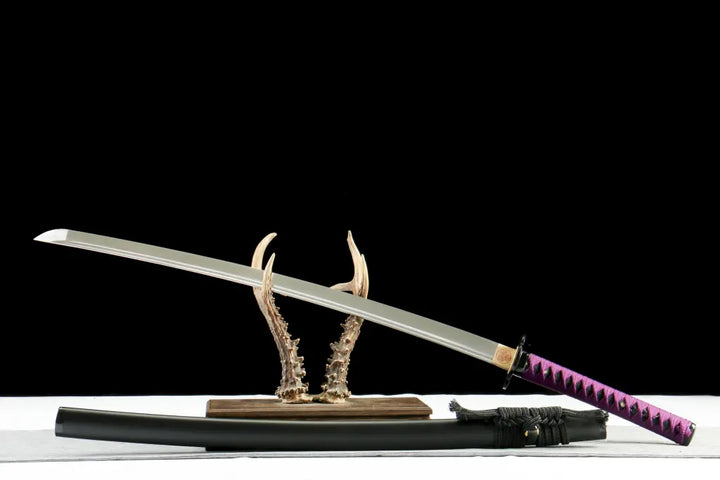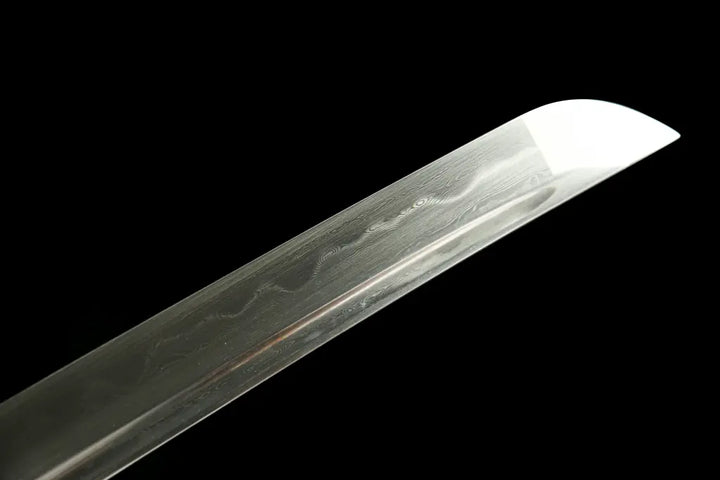 - Forged from folded T10 steel, showcasing layered grain (hada) with a natural hamon from clay tempering