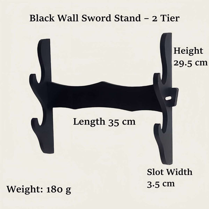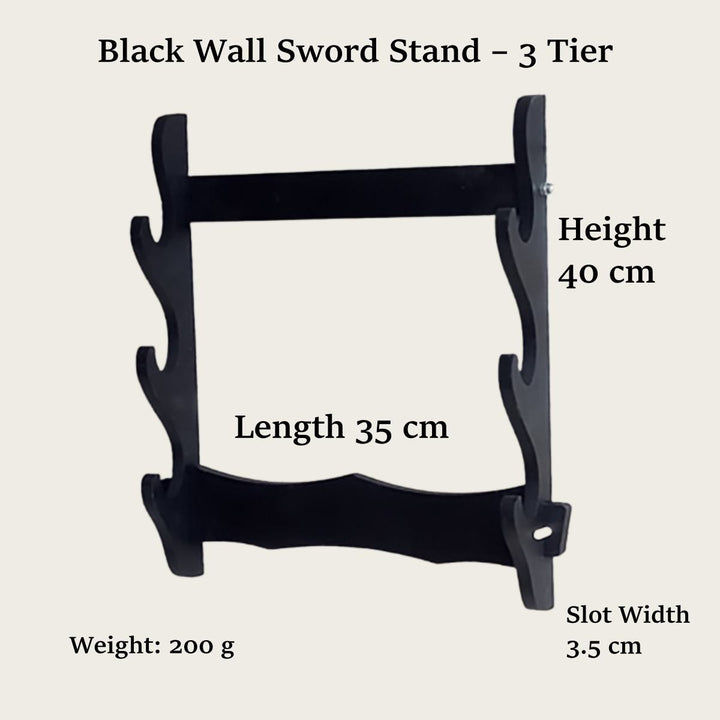 A practical wall-mounted hanger made from high-density board to display your swords and save space. Available in 1, 2, or 3-tier models. The classic black finish securely showcases your collection on any wall.