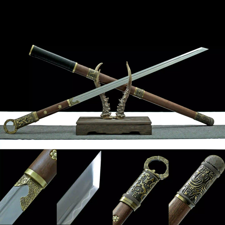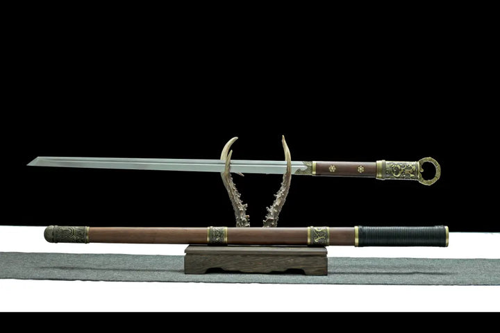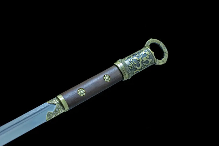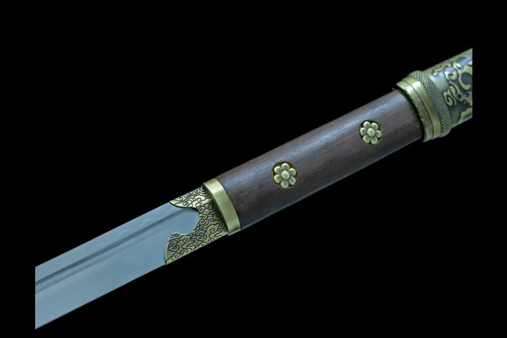 - Elegant chicken-wing rosewood saya with brass fittings echoes Tang-era decoration and provides a rich, tactile contrast to the darkened blade.
