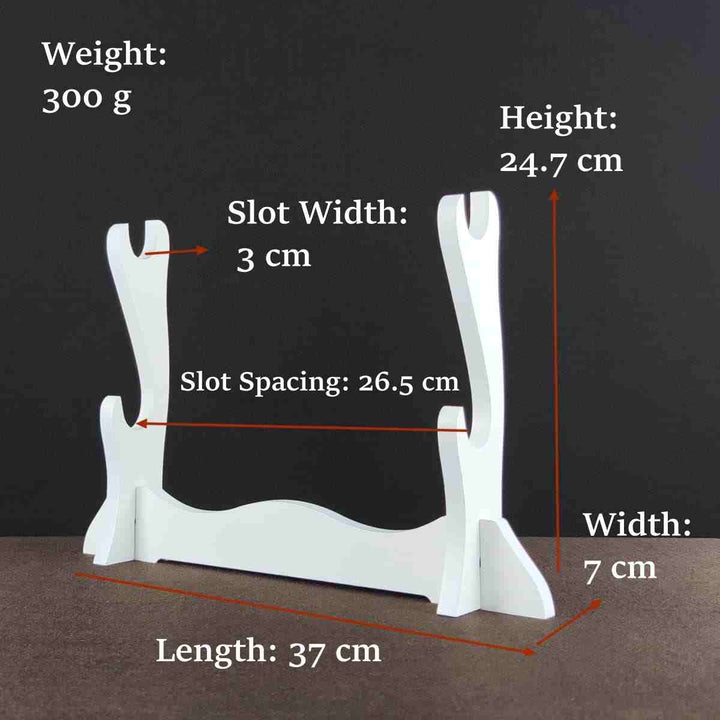 A simple and stable tabletop stand made from high-density board for displaying your sword. Available in 1, 2, or 3-tier models to hold your collection. The white minimalist design is perfect for any desk or shelf.