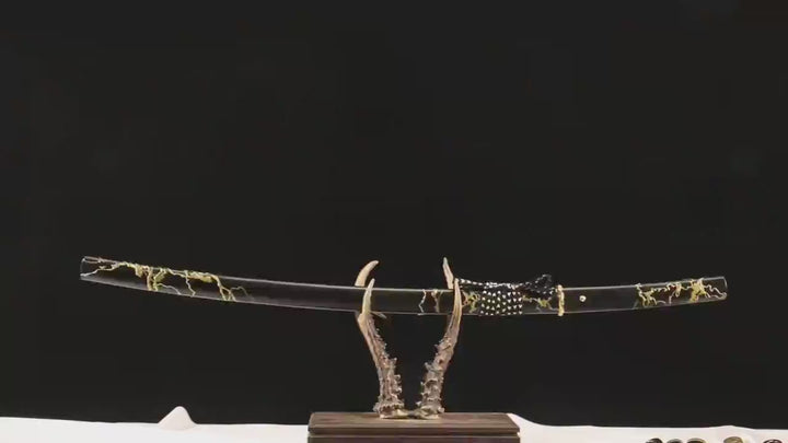 - Elegant midnight‑black lacquer finish on handle and scabbard contrasted with gilded patterning — embodying the “midnight gilded soul” theme.
