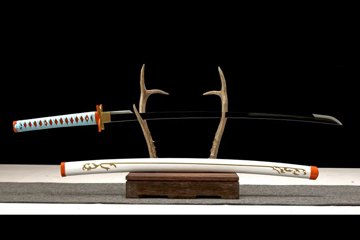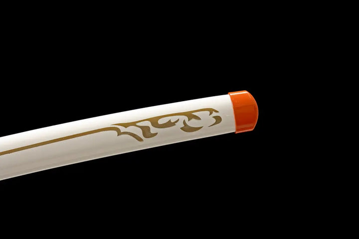 - White saya with gold floral accents and bright orange ends, matching anime design